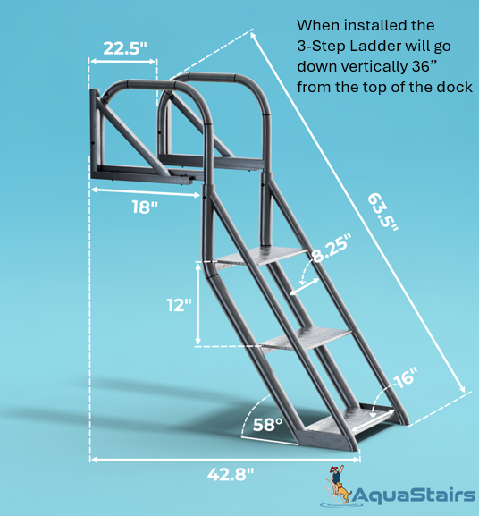 This 3-step dock ladder is simply the best swim ladder for both people and pets! It is designed for use on floating docks, fixed docks, piers, seawalls and swim platforms. It is 3' to the bottom step from the mounting surface